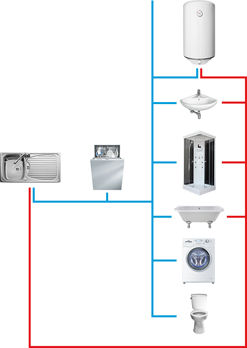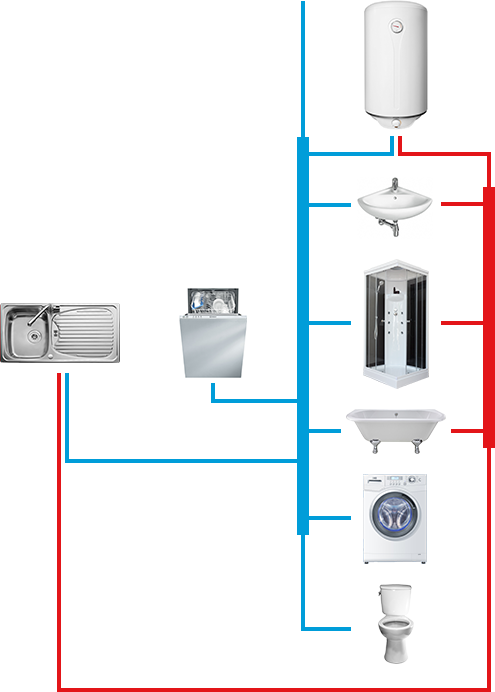 На представленной схеме наглядно представлен основной принцип устройства коллекторной разводки труб системы водоснабжения, где каждый водопотребитель подключается через отдельную трубу напрямую к коллекторам ХВС и ГВС. При этом труба не имеет разветвлений и каких-либо лишних соединений на всем своем протяжении, что исключает вероятность протечки. Соединений всего два и они доступны для ремонта и обслуживания (коллектор-труба и труба-водопотребитель).