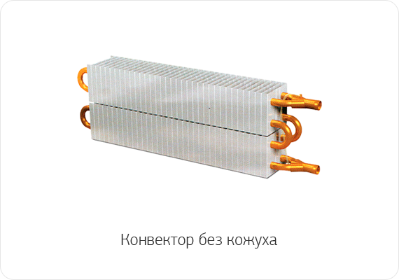 Конвектор изготовлен в виде трубки (как правило, медной или стальной) прямой или чаще змеевидной формы с многочисленными поперечными пластинами (стальными, алюминиевыми или медными). Кожух декорирует нагреватель и способствует повышению скорости естественной конвекции воздуха у внешней поверхности нагревателя. К конвекторам относятся также плинтусные отопительные приборы без кожуха. Могут применяться также системы контроля для автоматического отключения конвектора при достижении заданной пользователем температуры или при затрудненном оттоке воздуха (например, в случае перекрытия выходных жалюзи).