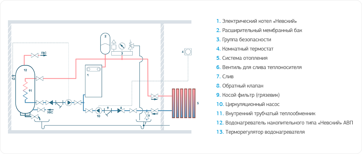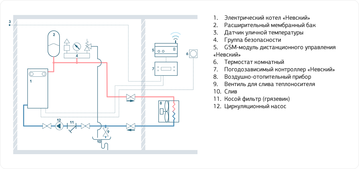 При данной схеме обвязки котла электрокотел поддерживает температуру в здании по температуре в контрольном помещении, где установлен комнатный термостат.