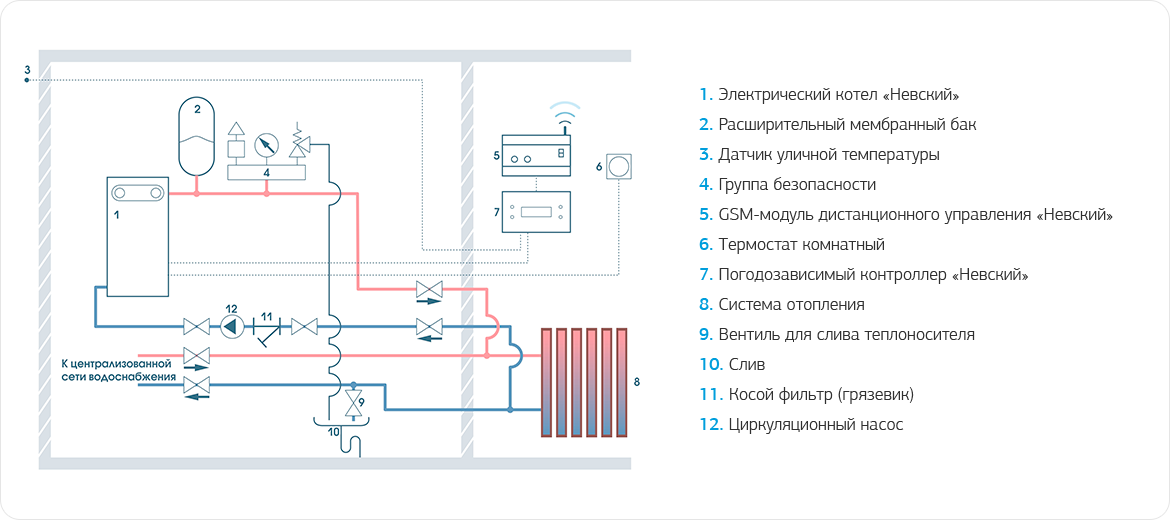 При переходе на автономную систему отопления с электрическим котлом, запорная арматура централизованной сети теплоснабжения перекрывает теплообменник и открывается запорная арматура на входе и выходе контура электрокотла, после чего система отопления работает по замкнутому контуру. В схеме можно дополнительно применить погодозависимый контроллер «Невский» и GSM модуль дистанционного управления.