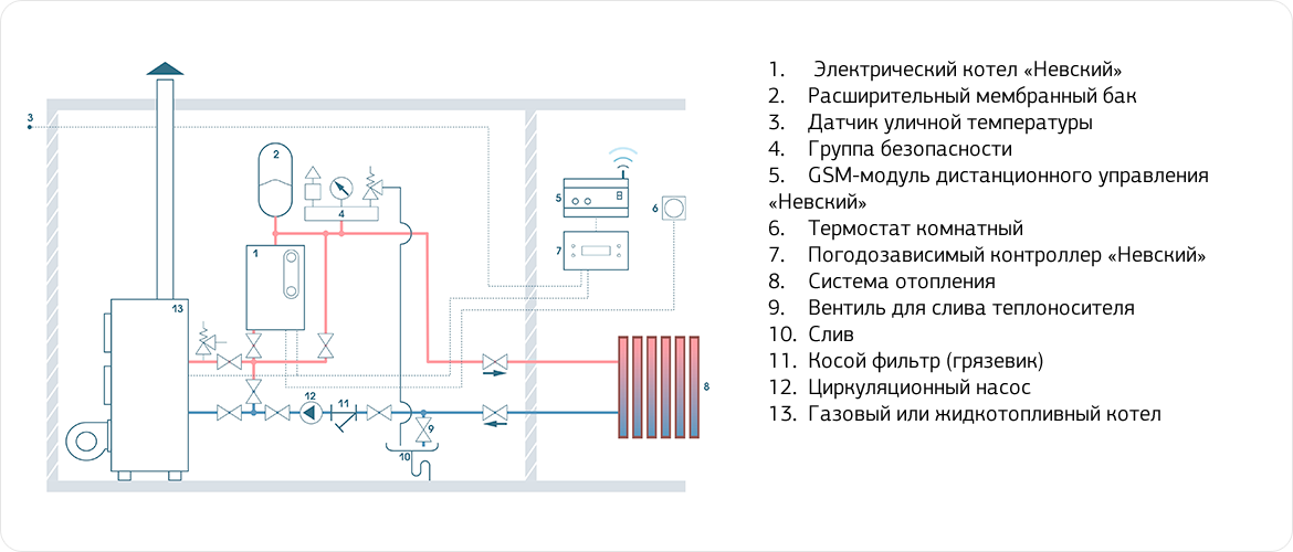 Электрокотел Невский можно использовать в качестве резервного при последовательном подключении с газовым или жидкотопливным котлом. При этом на терморегуляторе электрокотла Невский выставляется температура теплоносителя на 8-10° C ниже установленного на основном котле, а температура воздуха на компактном термостате электрокотла в помещении на 5° C ниже, чем установленная на комнатном термостате основного котла. Если по какой-либо причине основной котел (газовый или дизельный) остановится, и температура в помещении понизится – электрический котел автоматически включится, и будет поддерживать установленную на его терморегуляторе температуру помещения.
