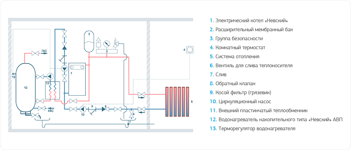 В зданиях, где требуется гарантированное поддержание климатических условий в помещениях (детские сады, больницы, интернаты, родильные дома) часто применяют схему с параллельным подключением к централизованной системе теплоснабжения электрических котлов «Невский». Электрокотлы используются, как резервный источник теплоснабжения в межсезонный период, когда котельные еще не работают (осенью) или уже не работают (поздней весной) или в период аварийной остановки централизованной котельной.
