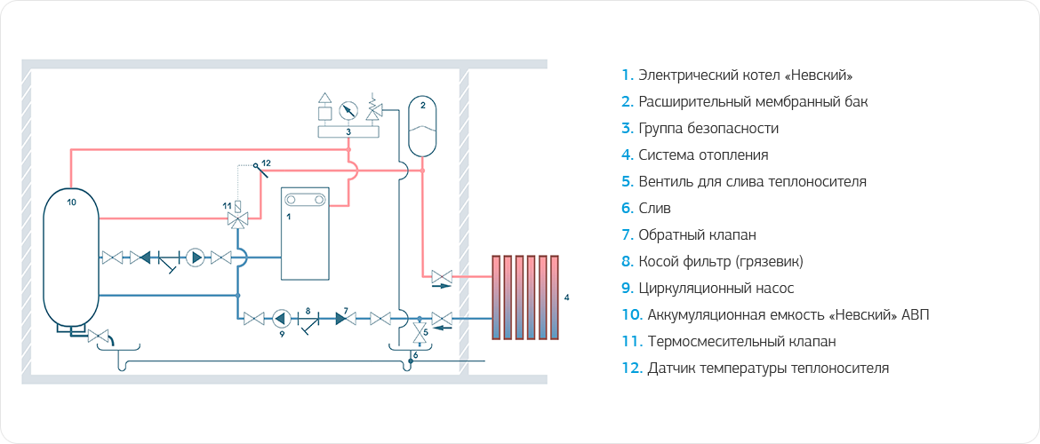 При работе электрокотла Невский с теплоаккумулятором основное время работы электрокотла – ночное. При этом электроэнергия расходуется по льготному ночному тарифу (должен быть установлен двухтарифный электросчетчик), что значительно снижает затраты. Электрокотел работает по замкнутому контуру котел - теплоаккмулятор и нагревает за ночь воду в теплоаккумуляторе до 90 °C. В дневное время электрокотел полностью или частично отключается. Требуемая температура в системе отопления поддерживается при помощи трехходового термосмесительного клапана с сервоприводом, который управляется датчиком температуры теплоносителя.