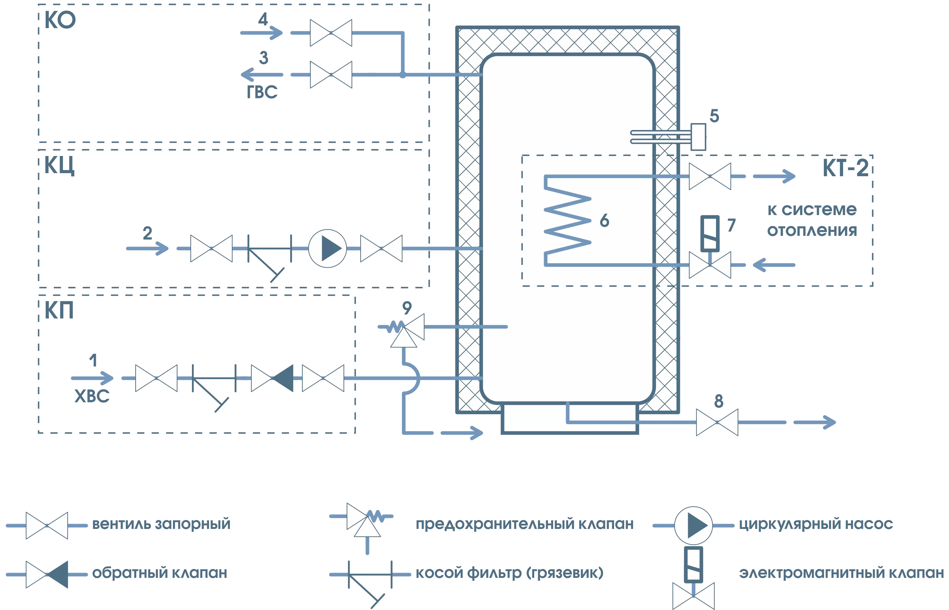 Встроенный трубчатый теплообменник 90 кВт представляет собой спираль из нержавеющей трубы, расположенную в нижней части бака. Он обеспечивает нагрев воды в баке водонагревателя горячим теплоносителем (водой или антифризом), проходящим через теплообменник. Регулирование температуры воды в водонагревателе осуществляется электромагнитным клапаном по сигналу от терморегулятора.