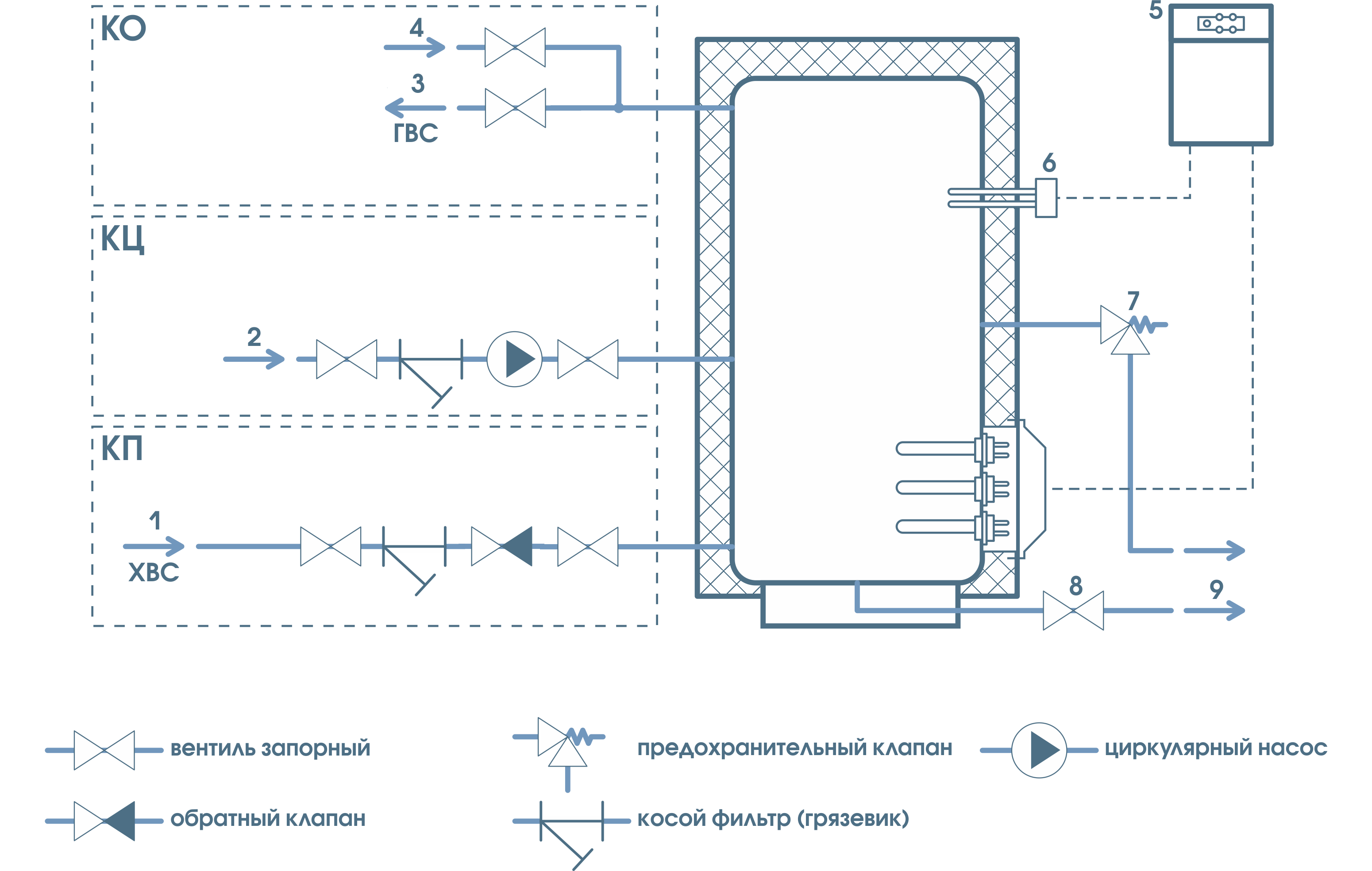 Водонагреватель горизонтальный 2000 л. легко обеспечивает пиковые расходы системы горячего водоснабжения и может применяться совместно с другими источниками горячего водоснабжения в качестве основного или резервного. Теплообменник косвенного нагрева бойлера может быть выполнен, как в виде внешнего пластинчатого теплообменника, так и в виде встроенного змеевика из нержавеющей стали, теплоноситель в который подается от системы отопления здания.